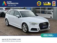 Audi A3 Sportback 35 TFSI S-LINE Algemene informatie Carrosserievorm: Hatchback (5-drs) Bouwjaar: feb. 2020 Tellerstand: 87.207 km Kleur: Wit Technische informatie Vermogen: 110 kW (150 PK) Aantal cilinders: 4 Motorinhoud: 1.498 cc Brandstofsoort: Benzine Transmissie: Automaat Aandrijving: Voorwielaandrijving Interieur Interieur: Zwart, Leder/stof Aantal zitplaatsen: 5 Verbruik Gemiddeld brandstofverbruik: 5,2 l/100km (1 op 19,2) Onderhoud, historie en staat Onderhoudsboekjes: Aanwezig Schade: s ...