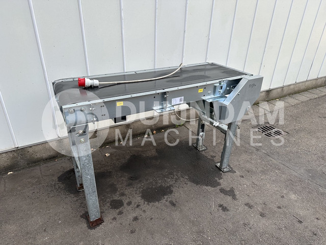 Deze transportband heeft gewerkt in een sorteer-/verpakkingslijn en werd door een centrale besturingskast aangedreven en dus ook aangestuurd door een frequentieregelaar. Doordat deze er nu niet bij is, is de snelheid van de band zo hoog.