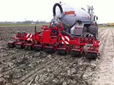 De bemester is 6 meter breed en om de 75 cm een woelpoot met daarbij mestinvoer op diepte.