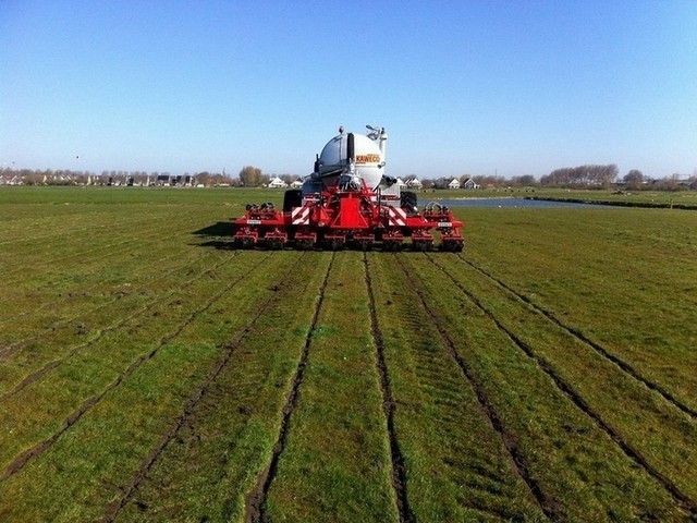 De bemester is 6 meter breed en om de 75 cm een woelpoot met daarbij mestinvoer op diepte.