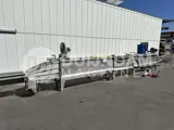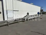 - Een kunststof ketting transporteert de kisten door de wasmachine.