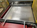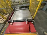 Centraal pallet aanvoersysteem. Bestaande uit een transporttrolley die onder de palletizers door rijdt. De baan zit in de vloer verwerkt. Portaal om pallets aan te voeren. 4 stapels voor lege pallets.
