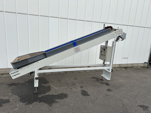Een enkelbaans fruitteller, speciaal voor citrusvruchte Maakt gebruik van fotoceltechnologie voor het tellen van het product en heeft een pneumatische trechter voor het lossen van het fruit.