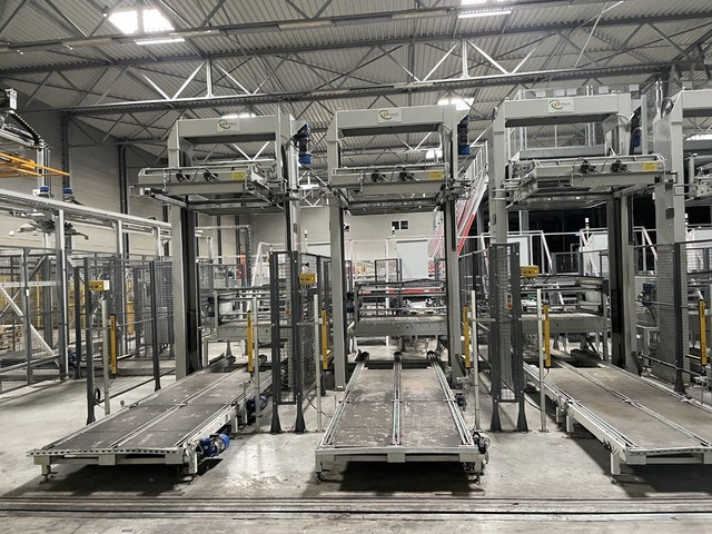 De machines hebben met 8 machines in één lijn gestaan, waarbij de pallets met behulp van een verrijdbare shuttle automatisch werden aangevoerd en omsnoerd met hoeklatten. Deze palletiseerders met ketting uitvoerbaan worden ook los verkocht