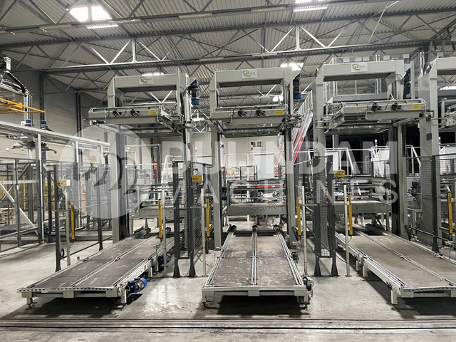 De machines hebben met 8 machines in één lijn gestaan, waarbij de pallets met behulp van een verrijdbare shuttle automatisch werden aangevoerd en omsnoerd met hoeklatten. Deze palletiseerders met ketting uitvoerbaan worden ook los verkocht