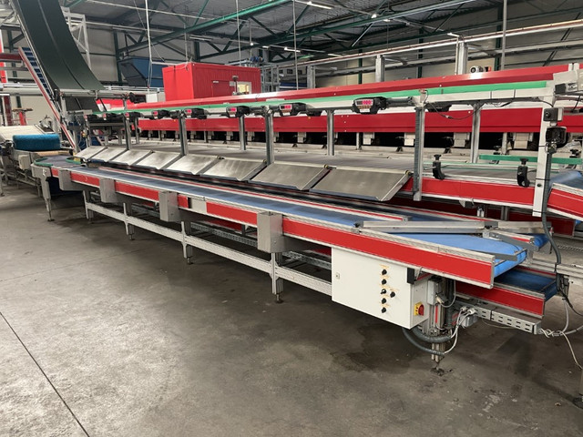 - Afvoerband volle dozen met schuine band naar beneden. T.b.v. afvoer volle dozen naar palletiseerder.