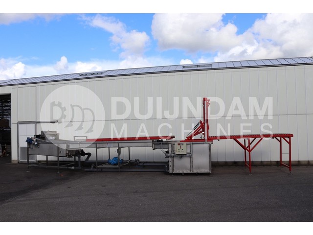 Met dit type onderwaterlediger worden de fruitkisten voorzichtig geleegd in een waterbak. Vervolgens worden de appels naar de sorteermachine geleid