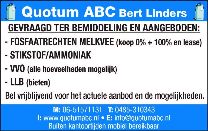 Voor bemiddeling en advies in fosfaatrechten melkvee bent u bij Quotum ABC op het juiste adres. Indien u fosfaatrechten wilt kopen/huren/leasen of op de hoogte wilT blijven van fosfaatrechten melkvee ( vraag en aanbod) neem dan geheel vrijblijvend contact op met Quotum ABC