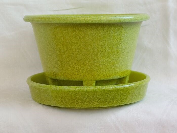 Zowel de bloempot als de onderschotel (diameter 15,8 cm) bevinden zich in een uitstekende staat.