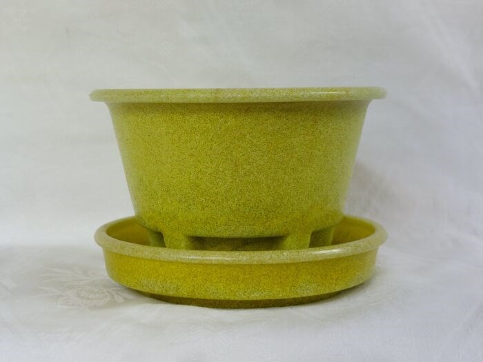 Zowel de bloempot als de onderschotel (diameter 11,5 cm) bevinden zich in een uitstekende staat.