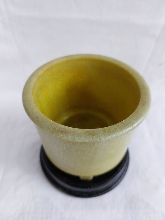 Art Deco graniver groengele cactuspot (height 8,4 cm diameter top 8,9 cm) en originele zwarte graniver onderschotel naar ontwerp van A.D. Copier voor Glasfabriek Leerdam.