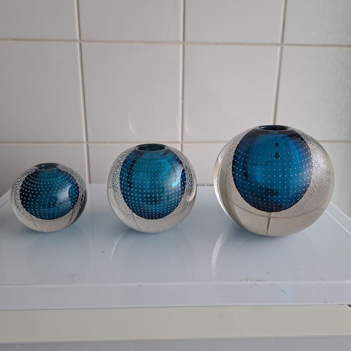 Een bijzonder zeldzame set van 3 spijkervaasjes met de kleur marineblauw. Het gaat om een complete set ontworpen door de bekende ontwerper A.D Copier voor glas-atelier Leerdam rond 1935. Het zijn de maten 11.5 cm , 8.5 cm en 6.5 cm. De grootste bol staat vermeld in het boek Copier Compleet onder de naam Serica no 52. De kleur blauw was 1 van de kleuren die weinig gebruikt werden, samen met licht en donkergroen. De bollen zijn gaaf,maar hebben enkele minimale gebruikerssporen rondom.Kortom een set voor de ware liefhebber! Bekijk de foto's goed om teleurstelling te voorkomen.
