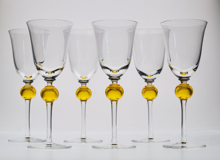 De glazen hebben de typische dunne kraag van Cenedese direct onder de beker en worden gekenmerkt door een geblazen bol in uraniumgele kleur.
