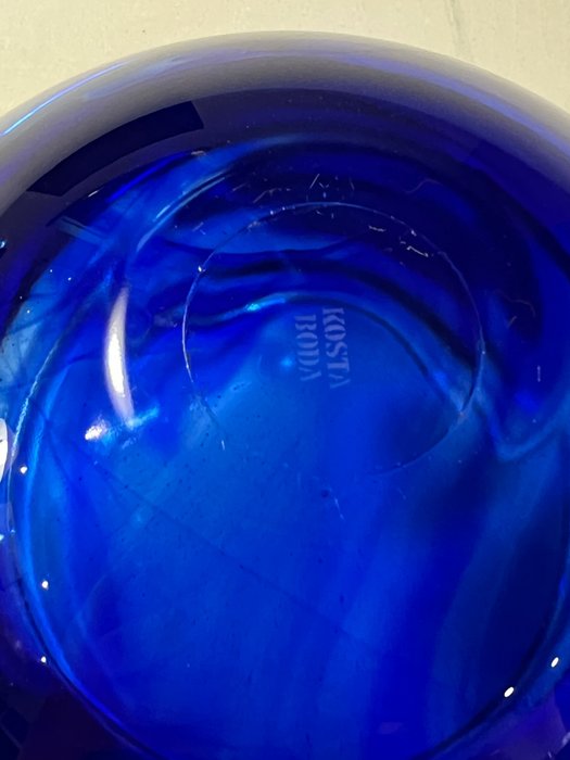 Mooie grote schaal (niet de kleine theelichthouders) van Anna Ehrners ”Atoll” swirl design voor Zweedse Kosta Boda. Ze kwamen in vele kleuren, deze set is in Hurricane Blue. Kom heeft beide een Kosta-sticker en "Kosta Boda" eronder geëtst.