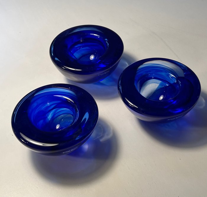 Prachtige set van 3 theelichthouders van Anna Ehrners ”Atoll” swirl design voor Zweedse Kosta Boda. Ze kwamen in vele kleuren, deze set is in "Hurricane Blue". Alle 3 de stukken hebben Kosta-stickers, twee ervan hebben ook "Kosta Boda" eronder geëtst.