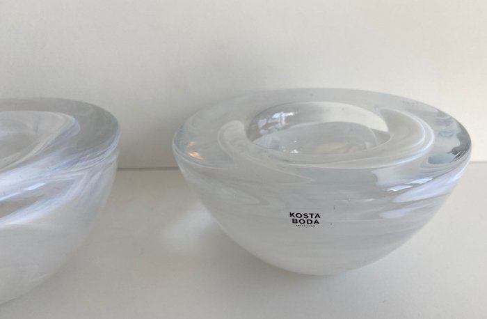 - 2 glazen waxinelichthouders 'Atoll' (ontwerp) welke zijn ontworpen door Anna Erhner voor de Zweedse glasfabriek Kosta Boda. Beide stukken hebben de originele sticker. Het glas is doorzichtig en wit van kleur; gemarmerd glas.