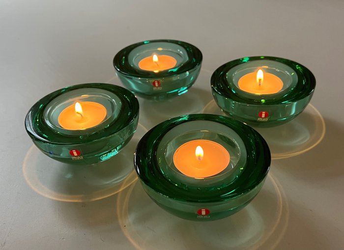 Mooie set van 4 stuks Anna-Leena Hakatie's bekende "Ballo" votief / theelichthouders voor Finse Iittala. Ze kwamen in vele kleuren, deze set is allemaal in dezelfde lichtgroene kleur. Alle 4 de delen hebben Iittala-stickers.