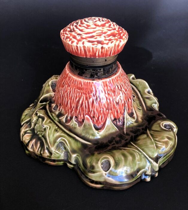 A very nice art nouveau porcelain inkwell, in the shape of an arthichoke, with outstanding colors. Marked, see picture underneath. It measures 16.4 cm wide, 11 cm high, 16 cm deep. In good condition, some normal wear, see pictures. Will pack very secure and will be signed for.