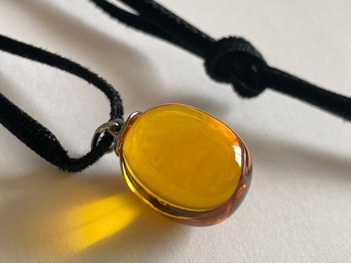 Baccarat hanger "Temptation" model, met zijn karakteristieke druppelvormige structuur in zijn gele topaas kristal versie en sterling zilveren beugel. Hij hangt aan een zwart fluwelen koord dat een breed scala aan lengteverstelling mogelijk maakt. De hanger meet 2,7 x 1,5 cm (handmatig meting) Een vleugje elegantie en licht geschikt voor elke gelegenheid.