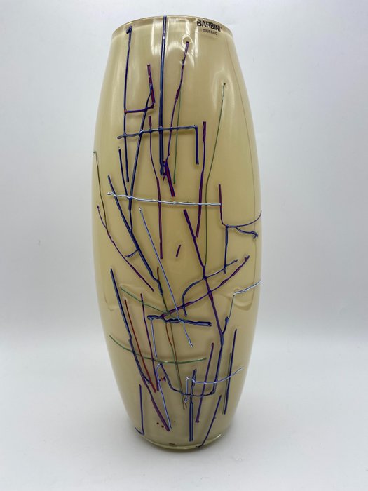 met toepassingen van glasdraden in felle kleuren in contrast met de zachte achtergrondkleur van de vaas zelf, die bijzonder rijk over het gehele oppervlak van de vaas is gerangschikt, vormt een ontwerp dat terugbrengt naar de conceptuele kunst van Mirò's lijnen.