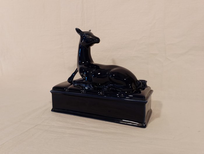 Aangeboden wordt een beeld van een hert, gemaakt van keramiek. Oorspronkelijk gediend als drankfles. Afkomstig uit Frankrijk.