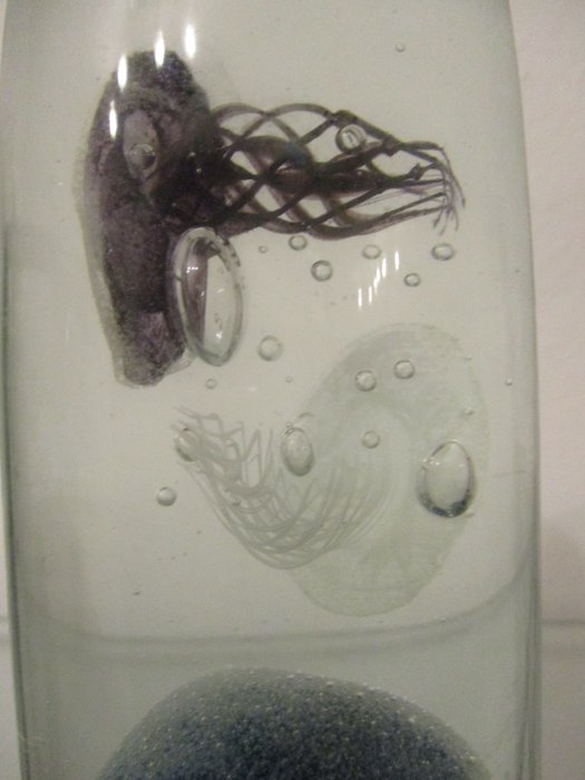 Helder, kleurloos glas met enkele decoratieve bubbels van drie kwallen in de kleuren aubergine, wit en turkoois. Het oppervlak van de kwal is bedekt met deeltjes uraniumglas. Sommige foto's zijn gemaakt met ondersteuning voor zwart licht. Zeer decoratief object!