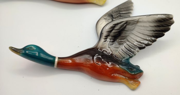 Lot van drie wilde eenden van verschillende grootte tijdens de vlucht.