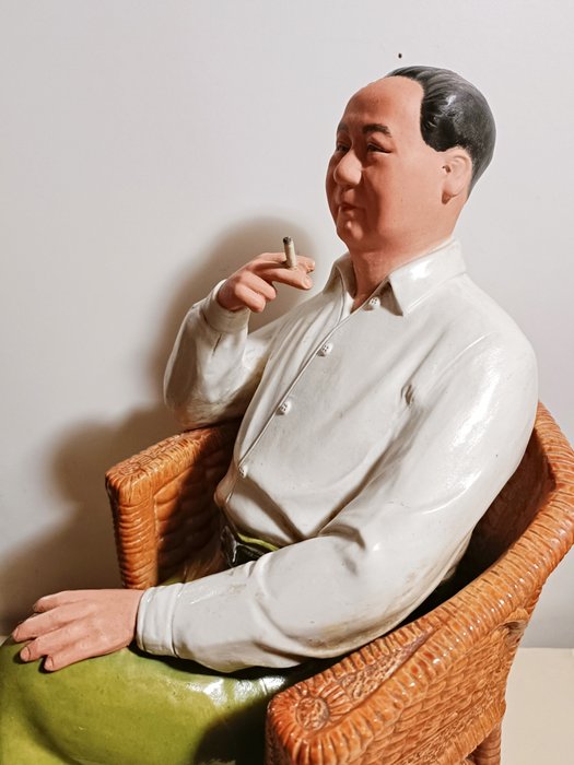 Polychroom keramiek beeldje voorstellende Mao Zedong, China, tweede helft 20e eeuw (H. 37 cm, L. 17 cm, D. 24 cm; zitvlak 17 x 15 cm, zie afmetingen met 50 cl fles).