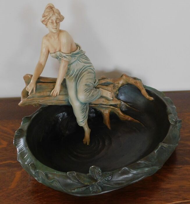 Op deze schaal zittend op een boomstam een mooie dame met haar voeten in het water.