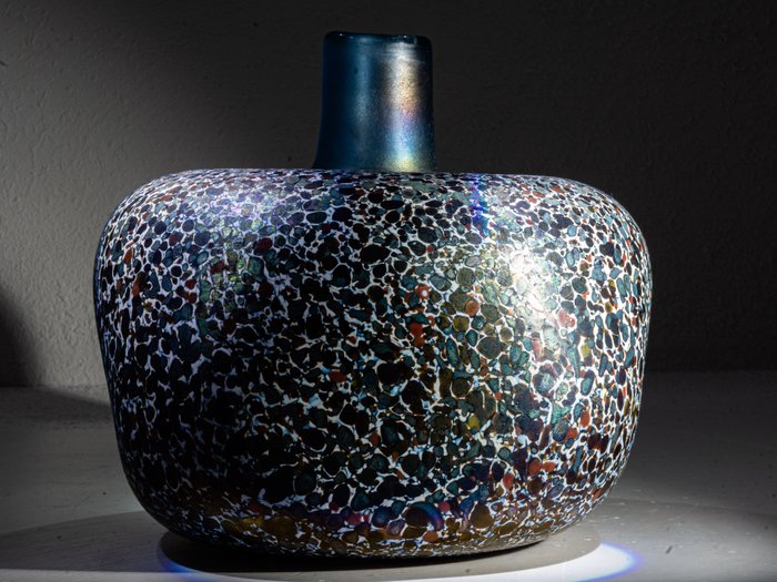 Organische afgeronde vierkante vorm. Gemaakt van dik ondoorzichtig glas met matte iriserende afwerking en aangebracht met een gekleurd confettipatroon. Korte hals met een gesatineerd oppervlak in iriserende blauwtinten. Gepolijst pontilmerk. De vaas maakt deel uit van een reeks gelijkaardig ontworpen stukken die Vallien in de jaren 70 produceerde.