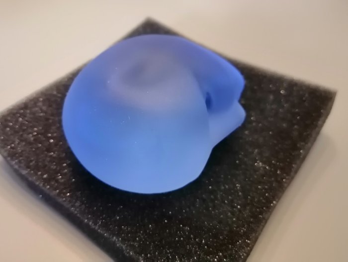 Het sculptuur is gemaakt uit blauw gesatineerd massief glas en in 7,5 x 6 x 5 cm.