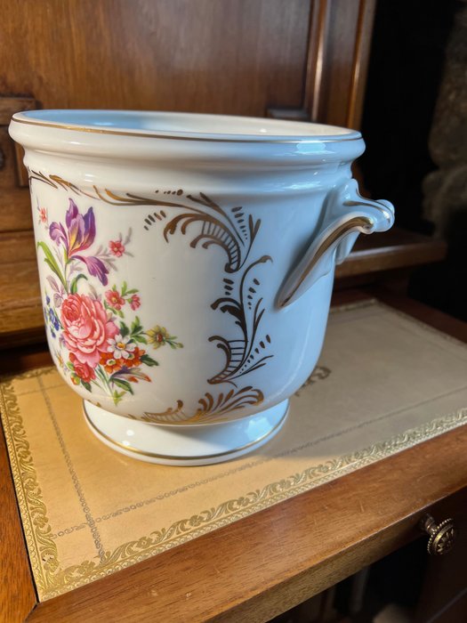 Porseleinen plantenbak met bloemendecoratie en gouden accenten.