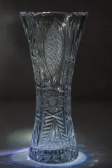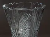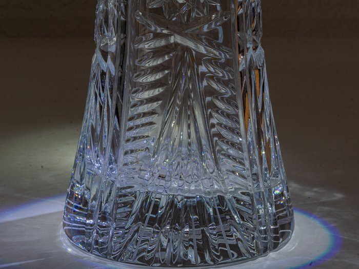 Elegant classic shape with jagged upper rim. Made of clear transparent lead crystal glass with wonderful hand-cut patterns. Large cut star at the base. Very beautiful optical effects - especially with a suitable illumination.