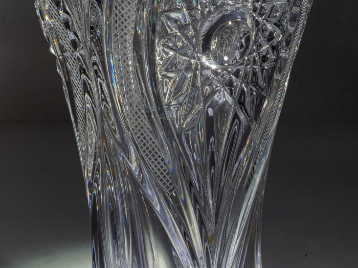 Elegant classic shape with jagged upper rim. Made of clear transparent lead crystal glass with wonderful hand-cut patterns. Large cut star at the base. Very beautiful optical effects - especially with a suitable illumination.