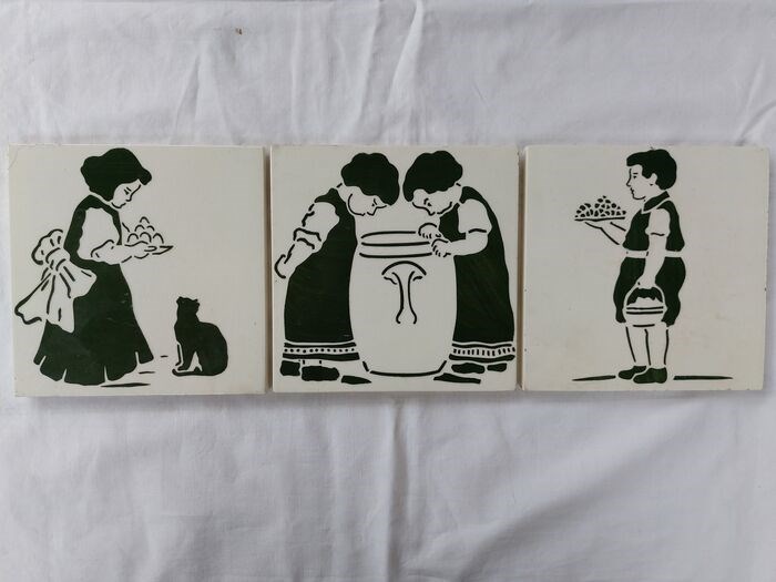 Drie jugendstil tegels (ieder 15,2 x 15,2 cm) met daarop kinderen gemaakt bij Boizenburg in Duitsland.