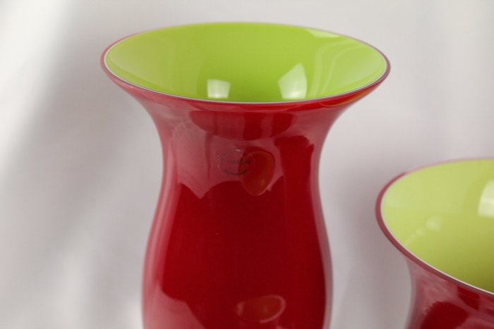Murano glazen vazen "serie opaline vazen FA" geproduceerd door de V.Nason&C./murano.com glasfabriek in groene kleur en rode overlay