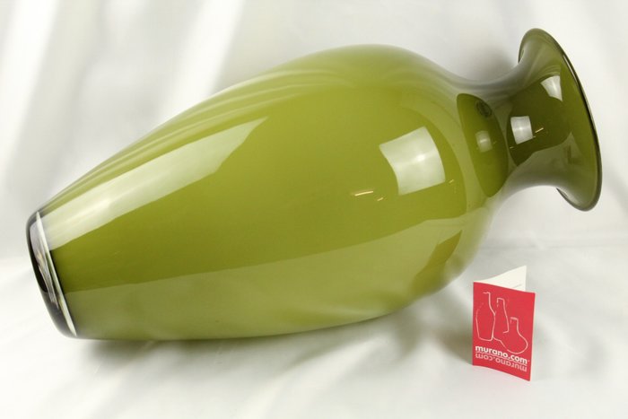 Olijfgroene Murano glazen vaas uit de “Vasi Opalini Anfora” Collectie, gemaakt door Nason/Murano, in omhuld melkachtig glas bedekt met een glaslaag in olijfgroen.