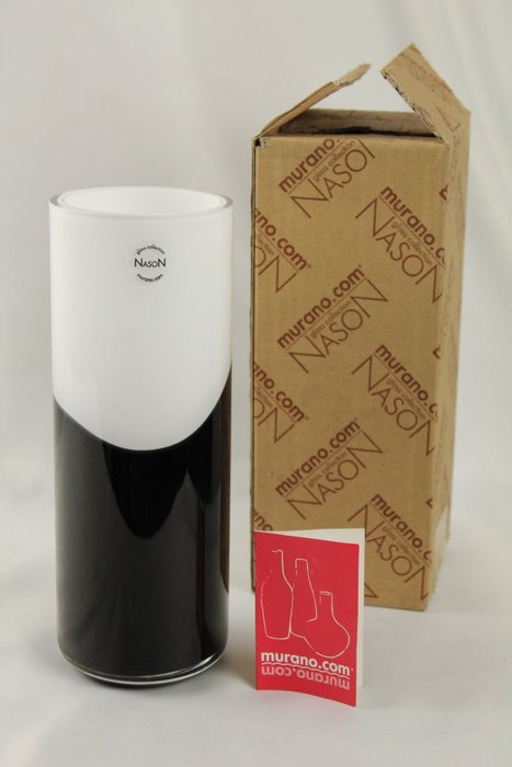 Witte en zwarte Murano vaas gemaakt met transparant, lattimo en zwart glas uit de "ETNO" collectie, vervaardigd door de glasfabriek V. Nason&C./Murano.com