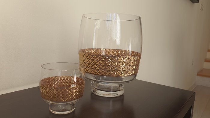 Het aanbieden van een prachtige en zeer zeldzame Cartier kandelaars. De ene is groot en de andere is klein voor theelichtjes. Volledig handgemaakte - mondgeblazen kandelaars, met handgemaakte en handgepolijste uitsparingen, beschilderd met 3 lagen geelgoud. Deze houders zijn van begin tot eind volledig met de hand gemaakt en dat maakt dit item tot een echt kunstwerk. De gouden decoratie reflecteert prachtig in de zon. Kandelaars worden alleen met de hand gewassen. De grote heeft een diameter van 16cm en een hoogte van 20cm. De kleine heeft een diameter en hoogte van 8,5 cm