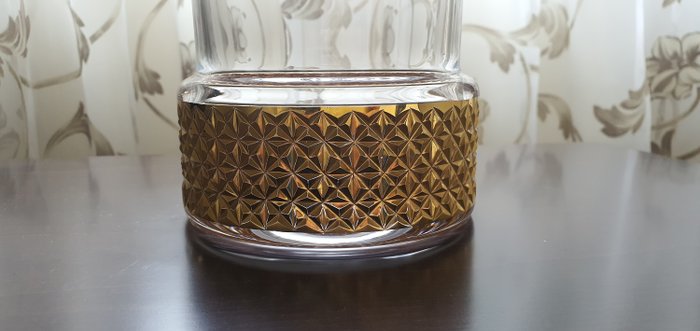 Aangeboden een prachtige en zeer zeldzame Cartier vaas. Volledig handgemaakte - mondgeblazen vaas, met handgemaakte en handgepolijste sneden, beschilderd met 3 lagen geelgoud. Deze vaas is van begin tot eind volledig met de hand gemaakt en dat maakt dit item tot een echt kunstwerk. De gouden decoratie reflecteert prachtig in de zon. Het wordt aanbevolen om de vaas alleen met de hand te wassen. Er is ook een bijpassende schaal die apart wordt vermeld.