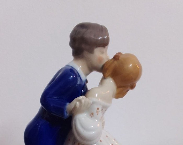 Porseleinen figuur van een jongen en een meisje genaamd "First Kiss", gemaakt door de Deense fabrikant Royal Copenhagen. Uit de serie "Jeugdige moed". Onderop gemerkt met het fabrieksmerk. Ontworpen door Claire Weiss. Hoogte 19,5 cm.