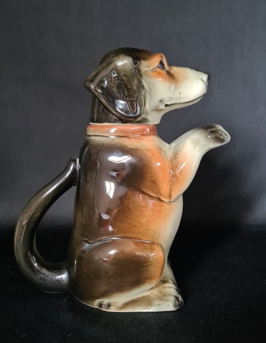 Prachtige theepot in de vorm van een eigenwijze teckel al zittend op zijn achterste pootjes met de twee voorpootjes omhoog die op die wijze gevormd zijn als schenktuit en zijn staart als handvat. Zijn hoofd is als deksel, hierdoor roteerbaar tot bijna animatische vormen. De Teckel theepot is gemaakt in de Cortendorf fabriek te Coburg welke is opgericht in 1890 door Julius Griesbach daar waar hoogwaardige keramiek werd gemaakt. In 1973 is het bedrijf overgenomen door W.Goebel. De theepot is in een uitstekende gebruikte staat met craquelé in het glazuur die van binnen door thee bruin zijn gekleurd. Verder geen gebreken of andere noemenswaardigheden. Erg leuk item!