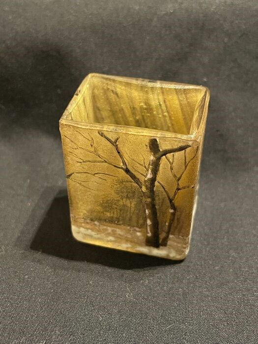 Prachtig Daum Nancy miniatuur vaasje met emaille decoratie van een winters boslandschap