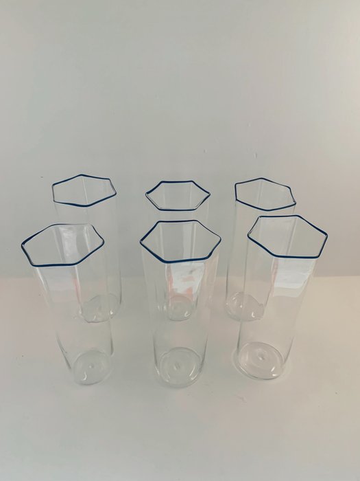 De drinkglazen zijn zeshoekig van vorm met een blauwe rand.