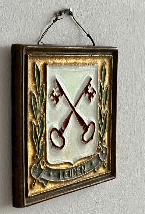 Cloisonné tegel met het stadswapen van Leiden.