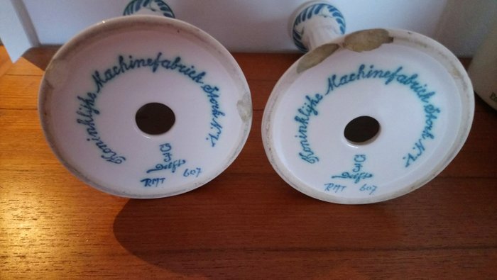 De twee zeldzame kandelaars van getint geglazuurd aardewerk op een ronde voet gedecoreerd in zachtgroene tinten met gestileerde bloemen en bladeren en gemerkt 1868 - 1968. Afgewerkt met een mat melkachtig glazuur. Gesigneerd aan de onderzijde in onderglazuur groen voor: