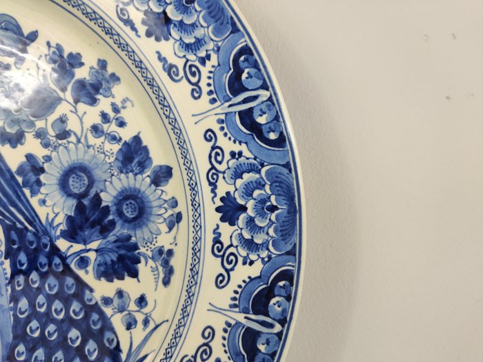 Schitterende handgemaakte en handgeschilderde wandschotel van porselein, welke is gemaakt door De Porceleyne Fles uit Delft, in 1947. Het wandbord is prachtig versierd met een afbeelding van een pauw en bloemen.