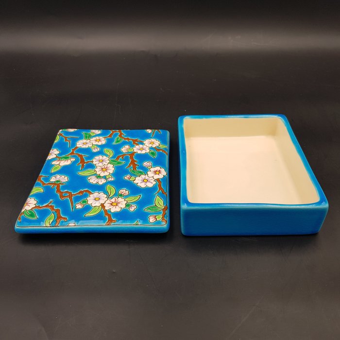 Van Franse makelij van Longwy (opgericht in 1798), beroemd om hun kwalitatieve cloisonne email, een rechthoekige doos gemaakt van aardewerk (faience). Met een bloem- en takkendecoratie, typerend voor de fabricage.