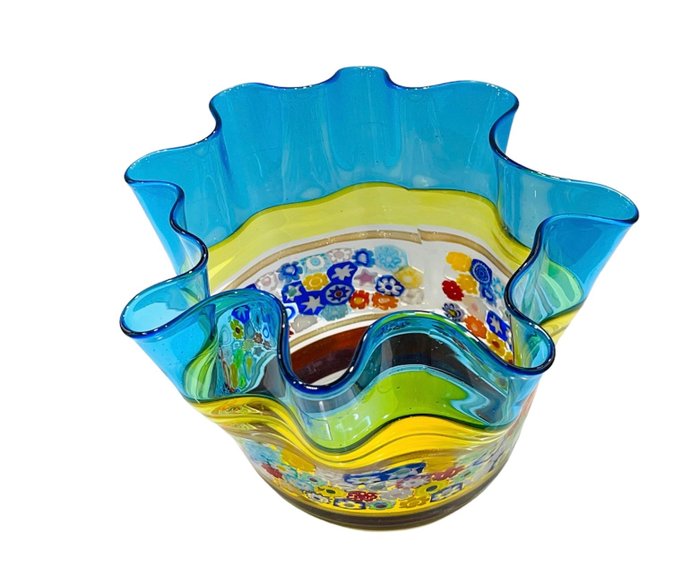 Artistieke zakdoekvaas gemaakt door meester Filippo Maso met de canne en millefiori murrine glastechniek, met de hand geopend en gevormd volgens de techniek van de meester glasblazers