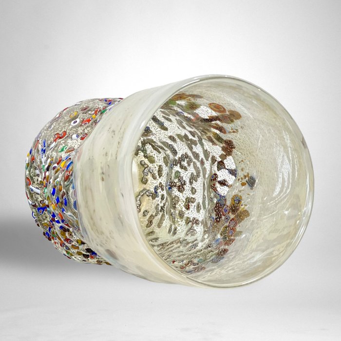Met behulp van de massa heet glas, bedekt met echt bladzilver, worden de millefiori murrine met een draaiend gebaar verzameld en samengesmolten. Vervolgens decoreert de kunstenaar, terwijl hij nog een massa gekleurd glas uit de oven haalt, de rand van de vaas, waardoor een druppeleffect ontstaat. Vanaf hier drukt de meester zijn ervaring in het object door de glasmassa met de hand te blazen en vorm te geven totdat hij zijn uiteindelijke vorm heeft bereikt.